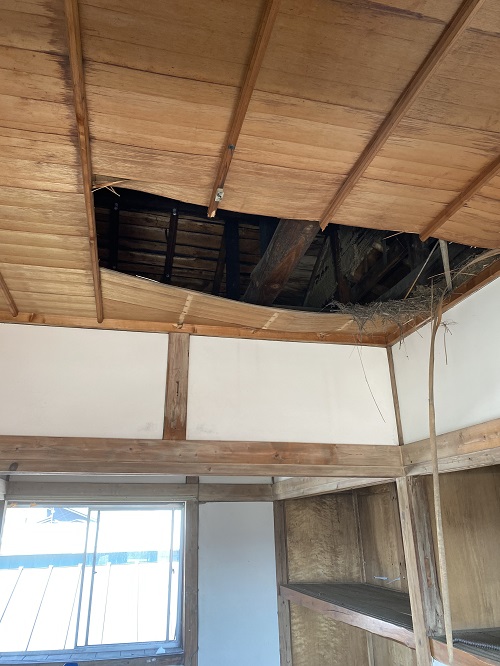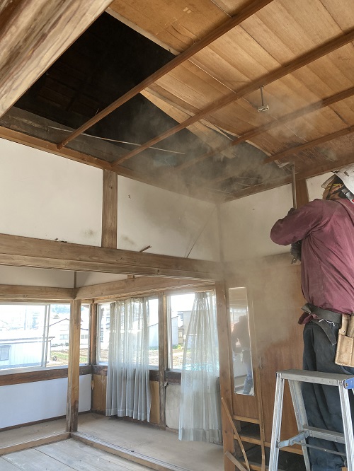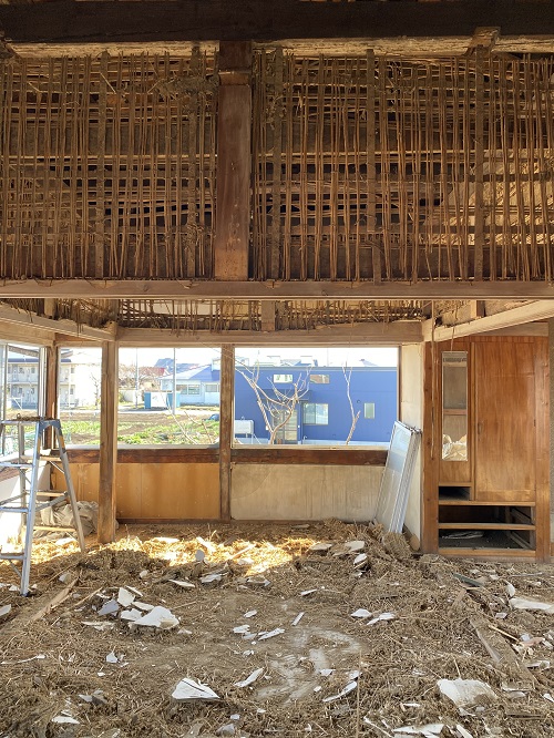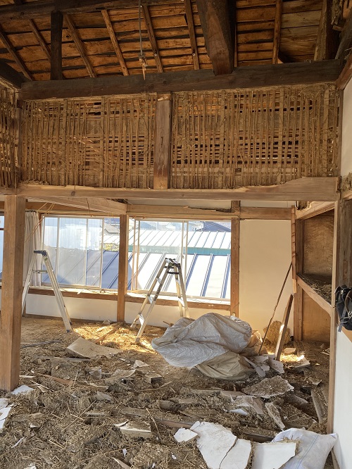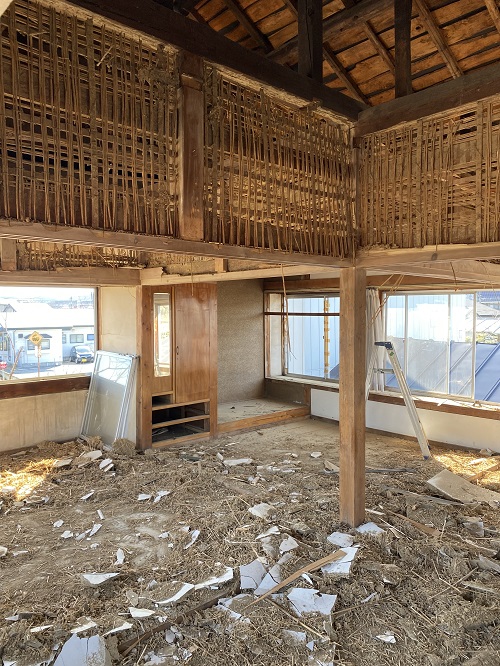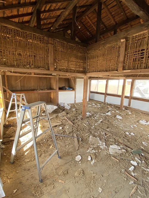 2階天井の取り外しから開始しましたが、解体を進めると土壁が出てきてしまいました。