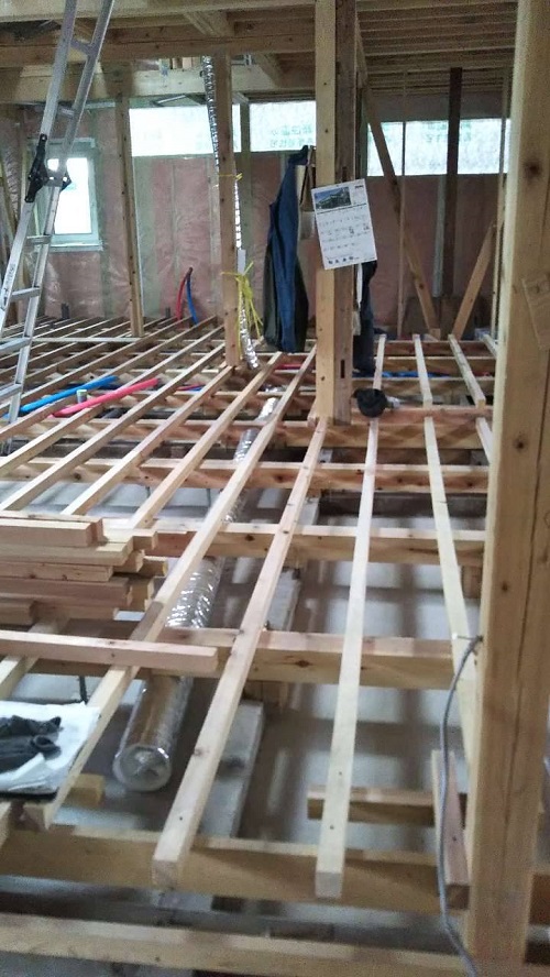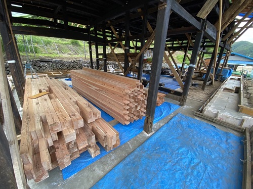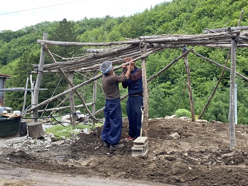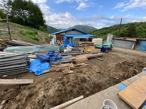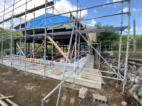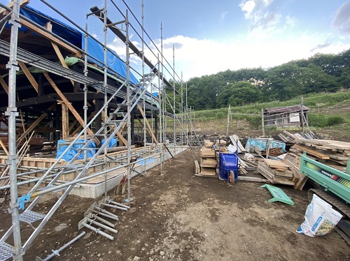 足場を組んで、外周部の構造壁の建て込み準備を進めています。葡萄棚などの手直しも手伝っている様です。