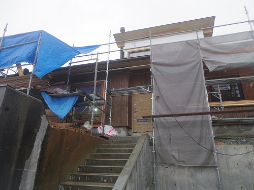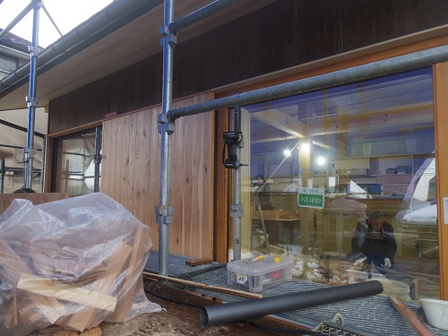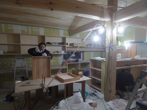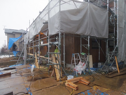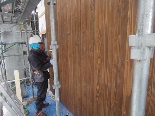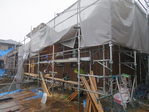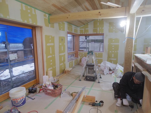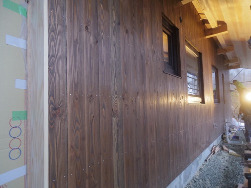 外壁工事は落葉松の外壁板張りが進みました。内部は大工造作を追いかける様に内装パテが進んでいます。