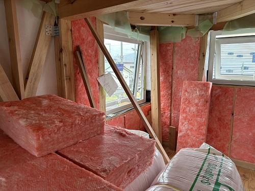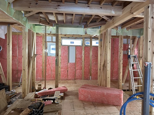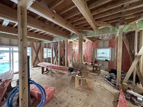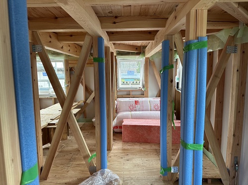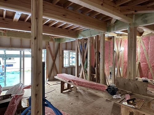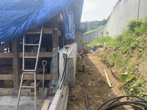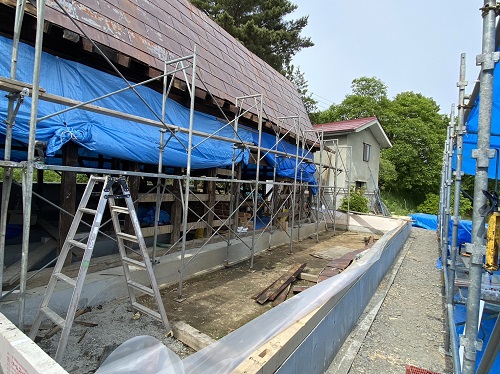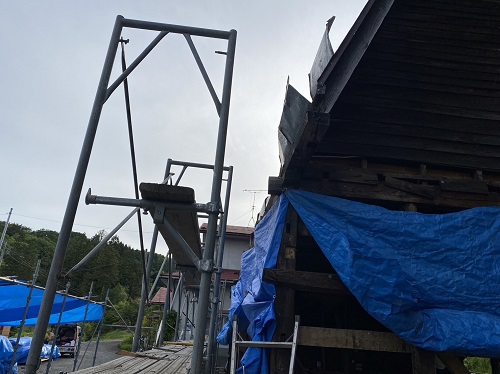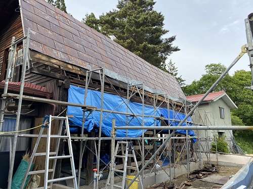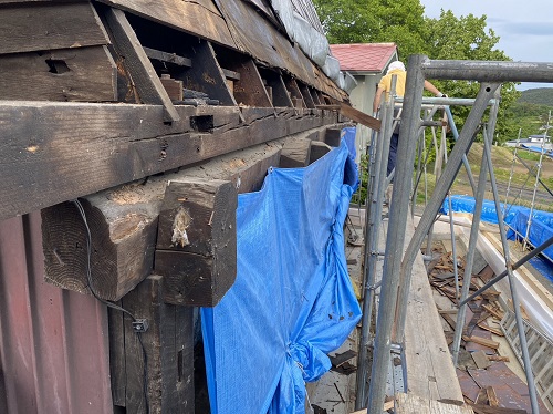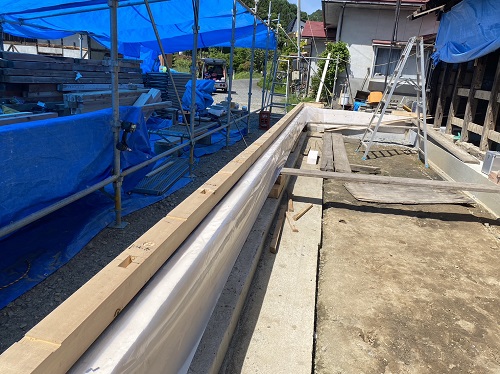 下屋と母屋の屋根絡み部の施工に取り組んでいます。