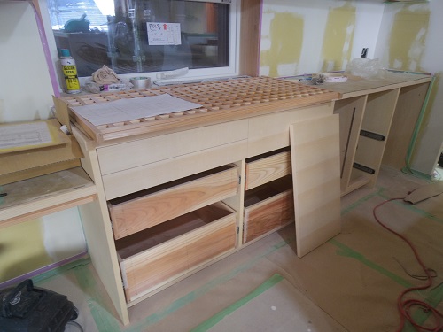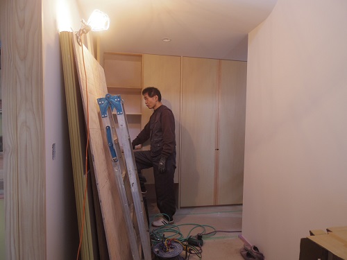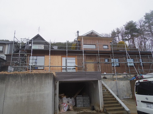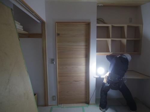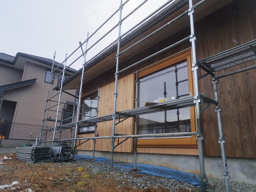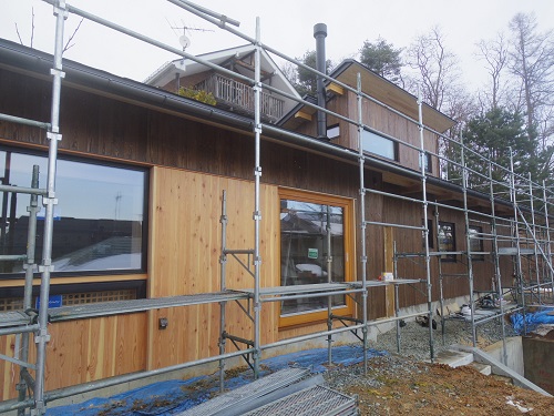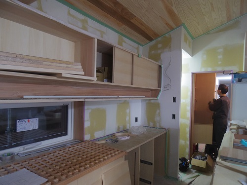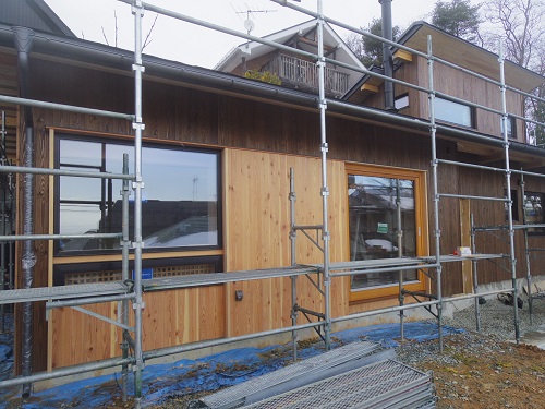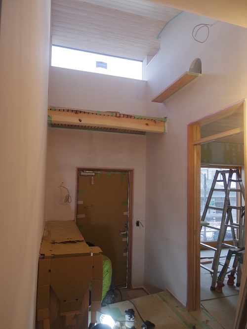 外壁が進み、内装と大工造作は大方で、建具の吊り込みも進みました。