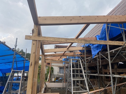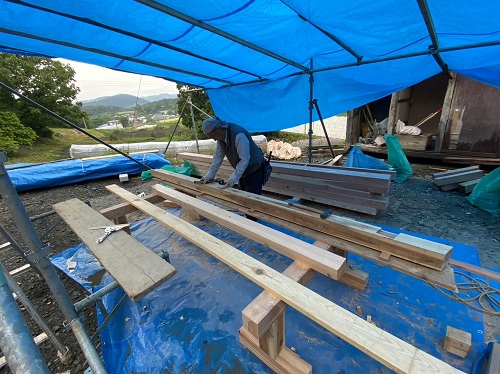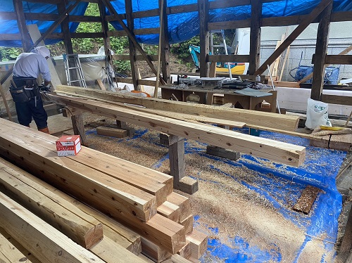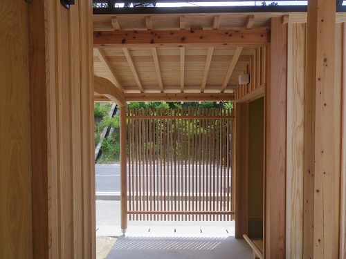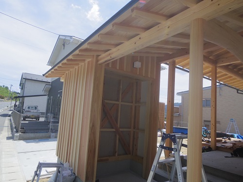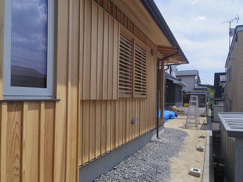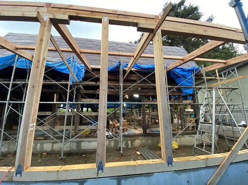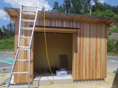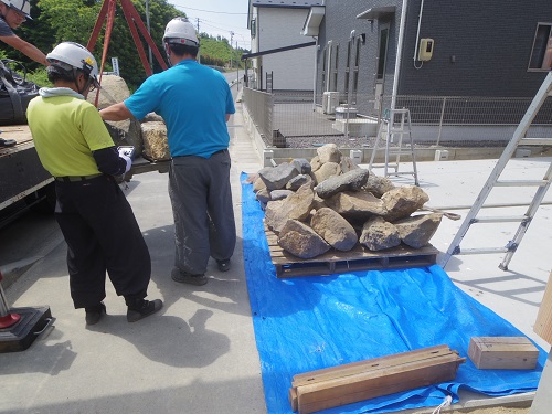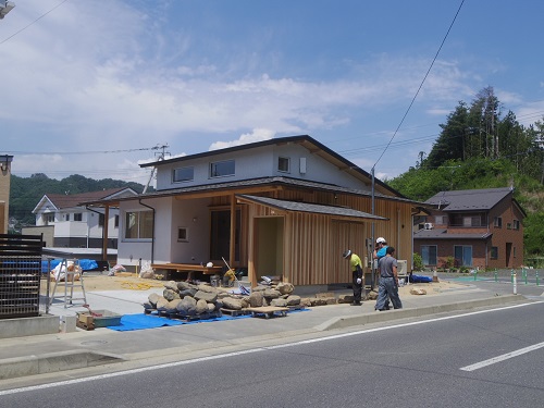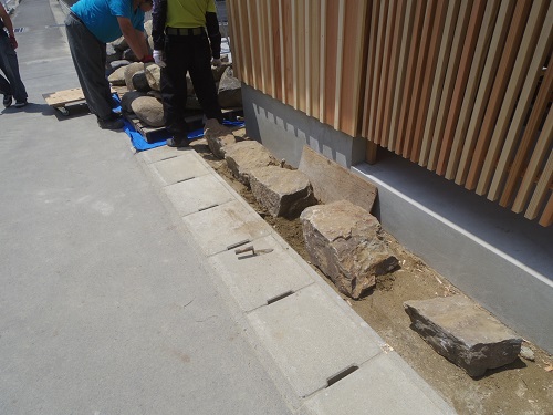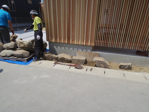 もうじき竣工です。外部では石積み工事に取り組み始めました。