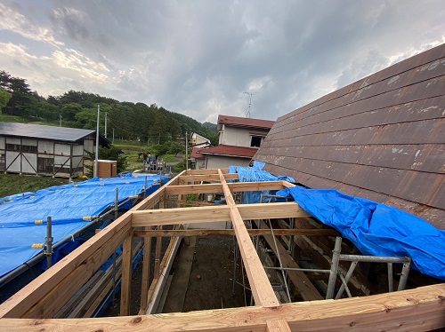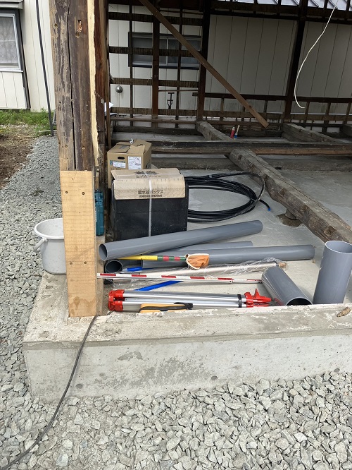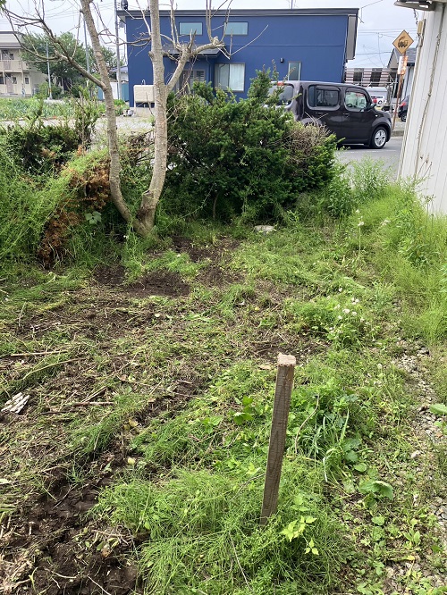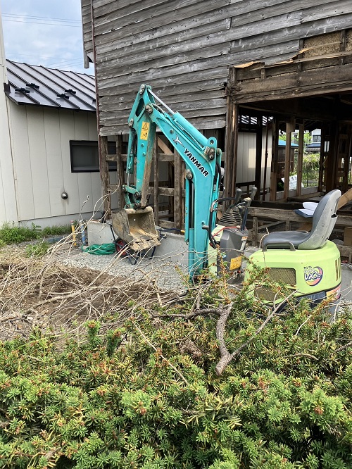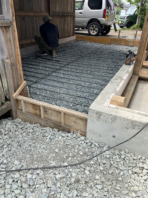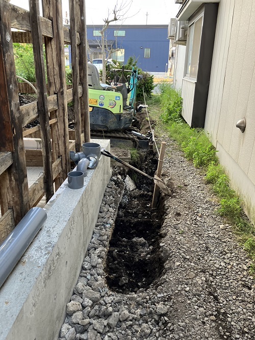 土間は配筋が進み本日コンクリート打設となります。外周部は下水配管工事が進みました。道路側の肺かになるので、植栽がと掘り上げられてしまいました。