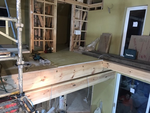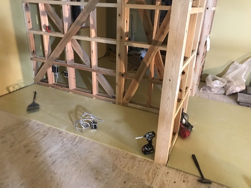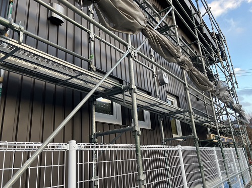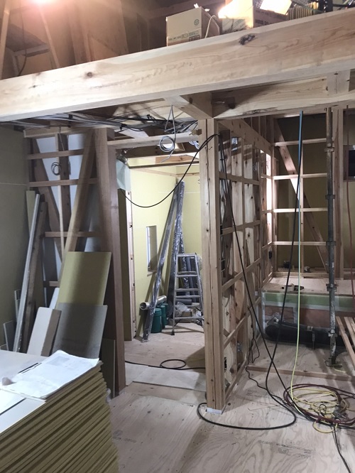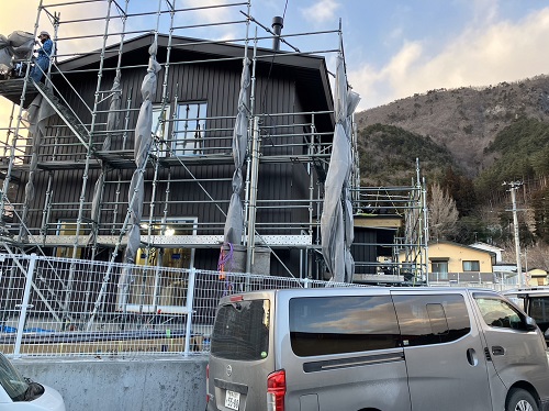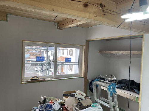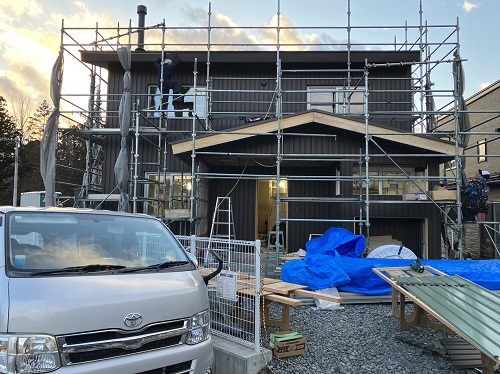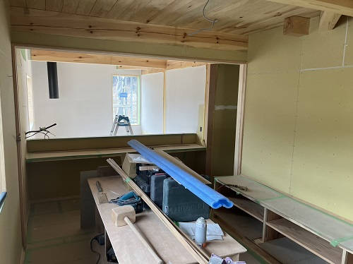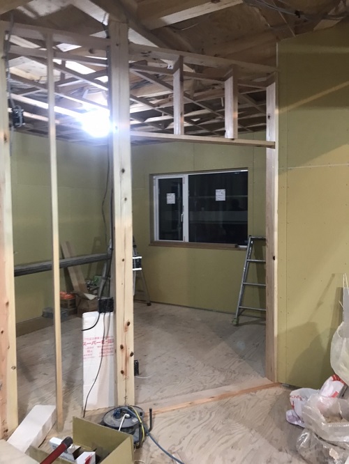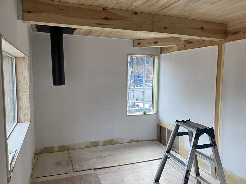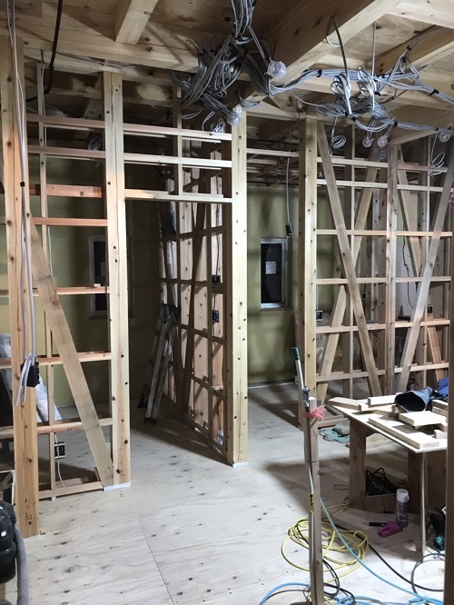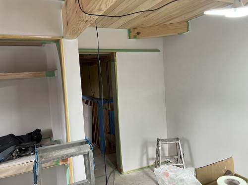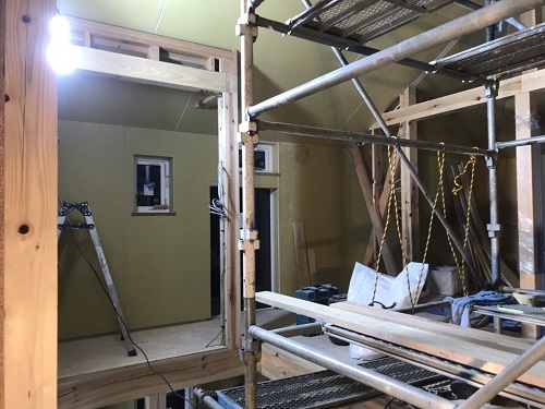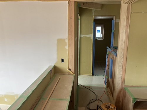 外壁工事は玄関先の破風板金の取り付けを残すだけとなり、内装工事は一部壁が白くなりました。