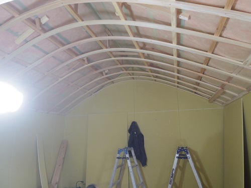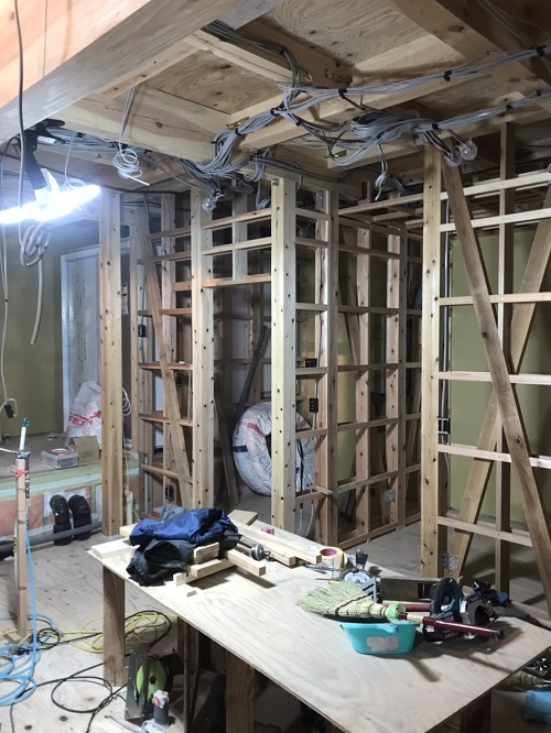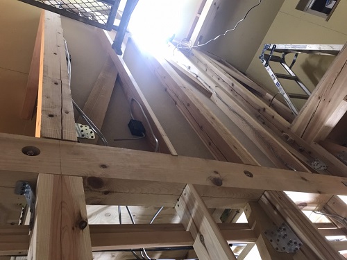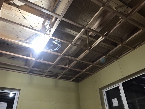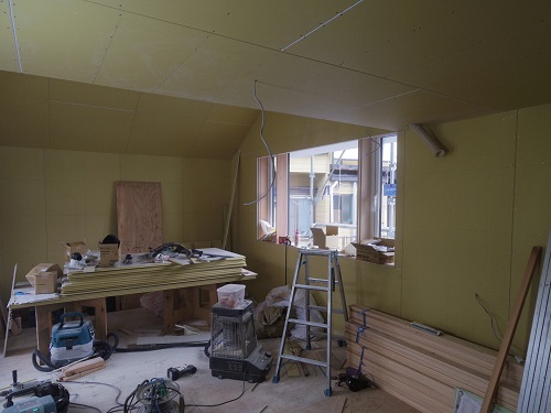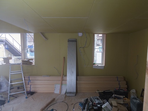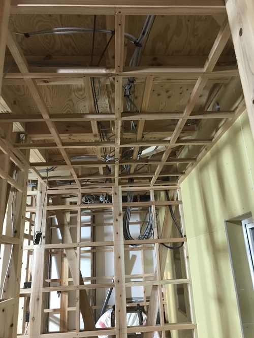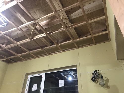 外皮側防火構造のPB張込みが進み、天井下地の取り付けが進んでいます。