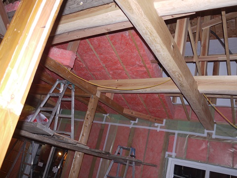 構造補強した赤松の梁の上側を包み込むように断熱を入れて梁を表しにしています。大分ゆっくりとしたペースでしか工事が進まない感じがすると思いますが、こうした工事をしないで単純にうわべのみ綺麗にする仕事をしてしまえば早くは進みます。でもそれは手を抜く事になるのです・・・時間を掛けた分は改修工事と云えども新築と全く遜色ない工事になります。と云っても我々も早く完成させねばと焦りの気持ちは生じます。震災前は応援大工さんが多かったのですが、震災以降は本当に人手不足で悩ましいですね・・・実は、震災前の日記で世の中が、職人不足で困らぬように対策が必要と書いていたのものです。