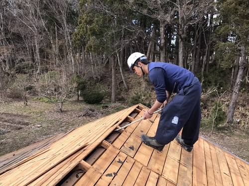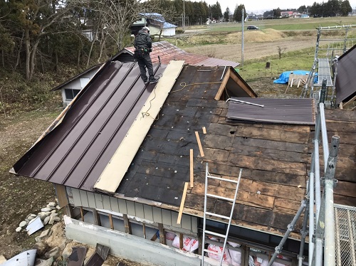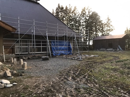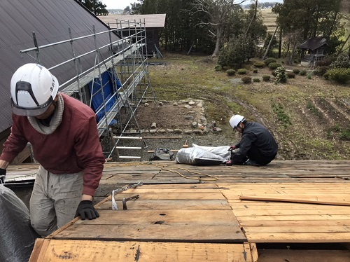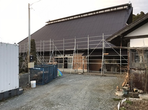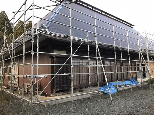若手のみで取り組んでいる大改修現場です。茅葺屋根下は昔ながらの座敷や仏間ですが、折り返しの住まい側の屋根工事にも取り掛かりました。外では茅葺を外す段取りで足場も組まれました。