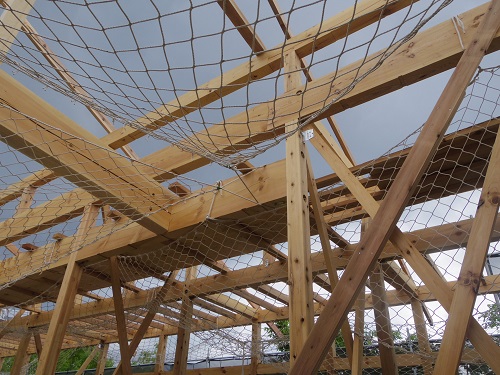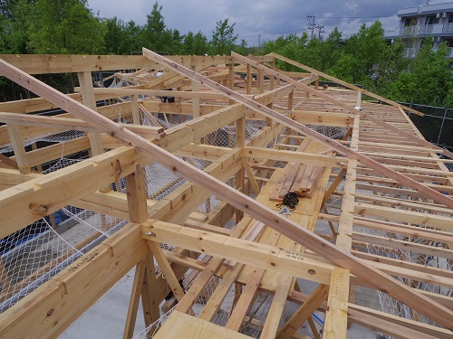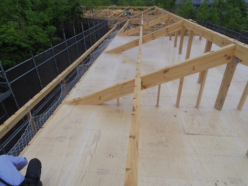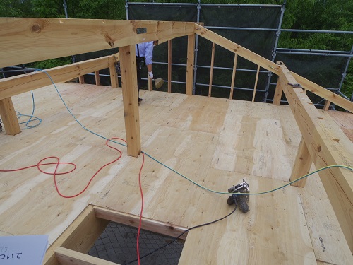 水平構面造りと構造補強工事が進んでいます。昨日の様な雨が降ると本当に大変です。でも天気ばかりは人の力では何ともし難いので、合板に防水材を塗布するなどしているとの事でした。