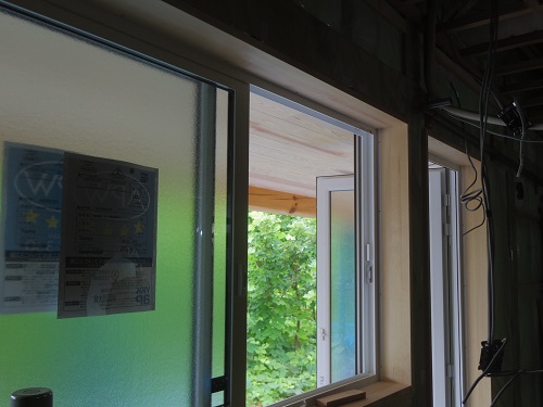 サッシ枠の取り付けも一部進みました。