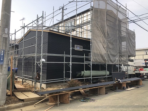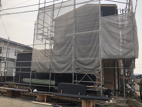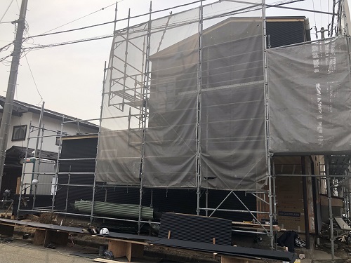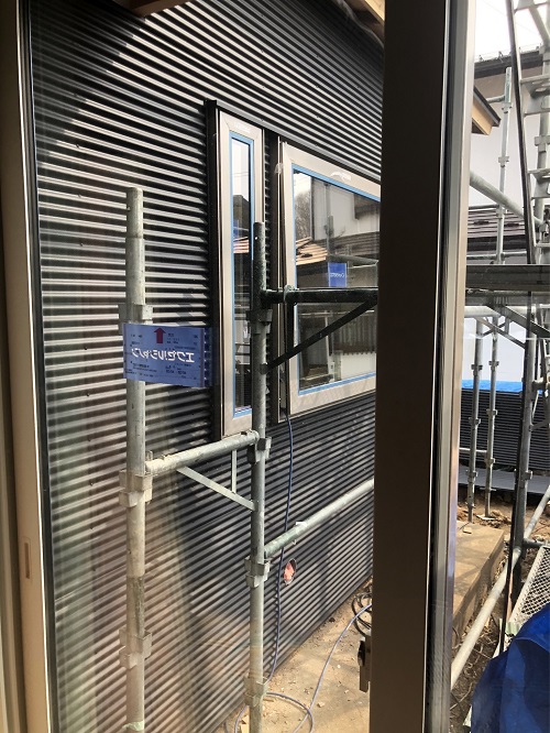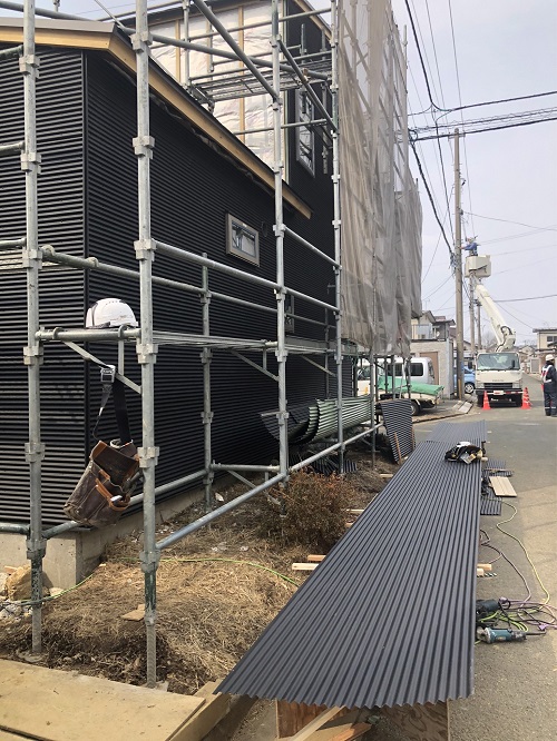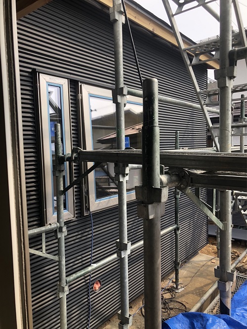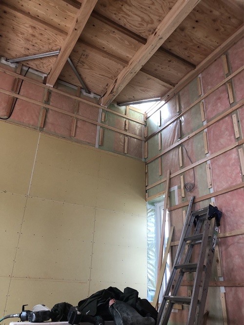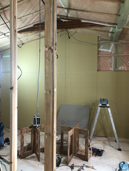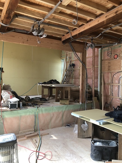 外壁工事が進み、電気配線が行われたので、ボードの張込みも進みました。