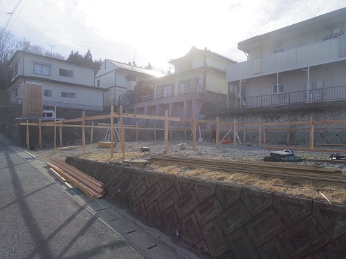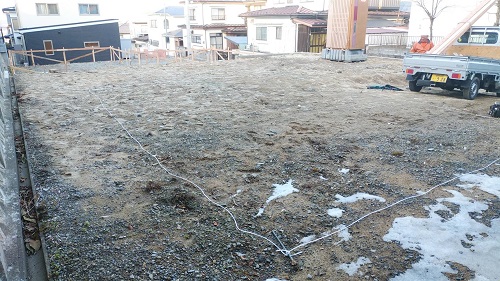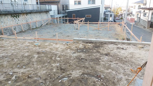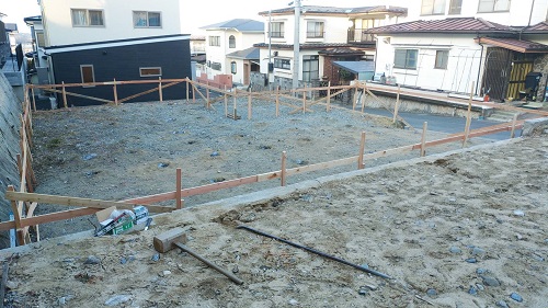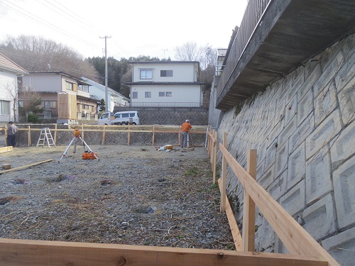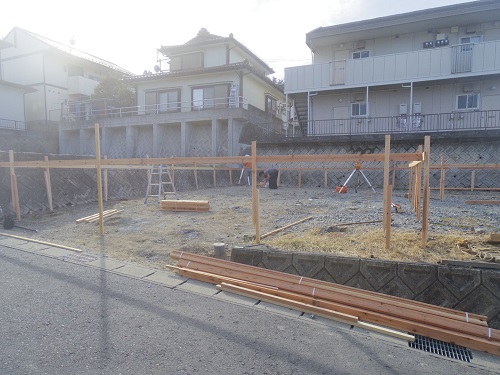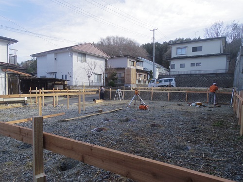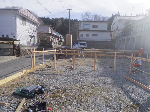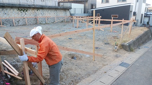 基礎工事は地盤改良工事を終えて、遣り方の取付が進みました。