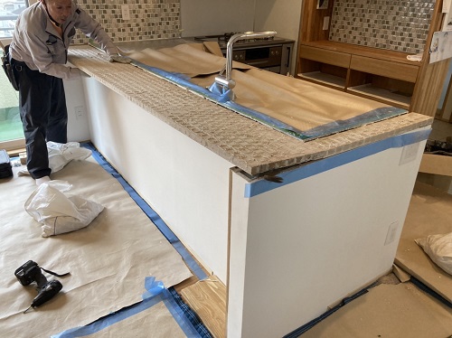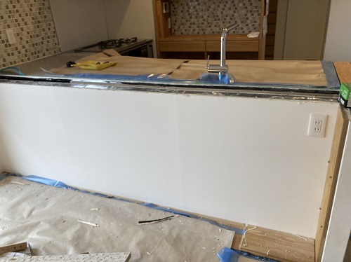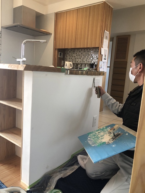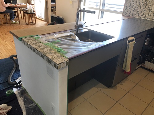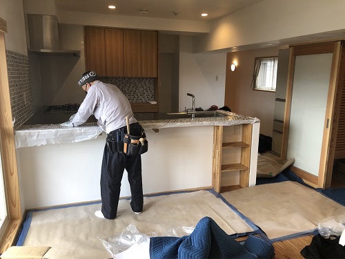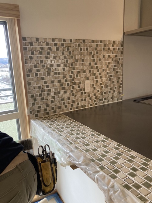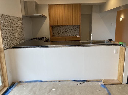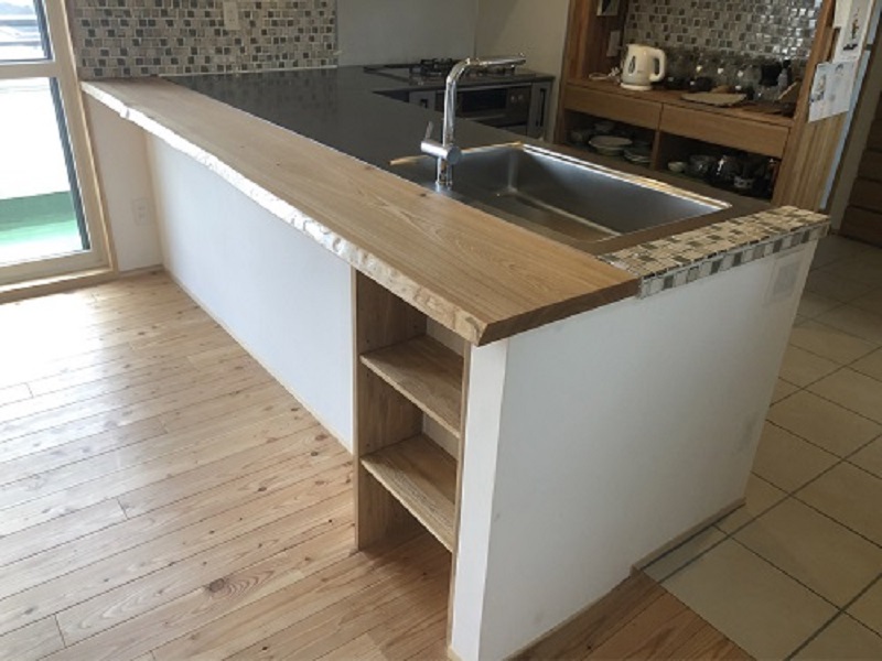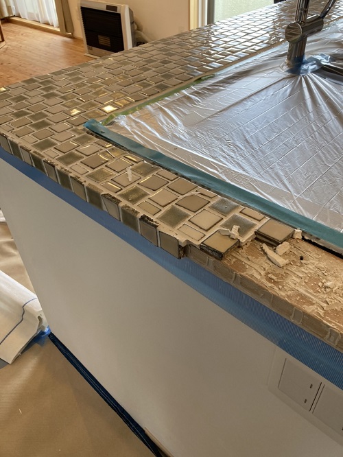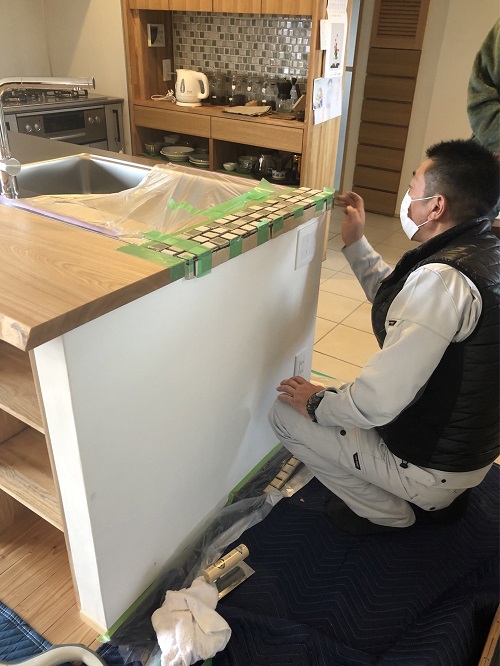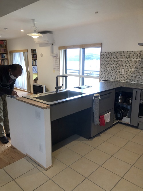 岩泉純木家具様からのご依頼で流し前の改修工事を行わせて頂ております。流し前の無垢カウンター取り付け工事は純木家具様でそれ以外の既存カウンター取り外しと、タイル張り直しと壁の漆喰塗りが当社の施工です。