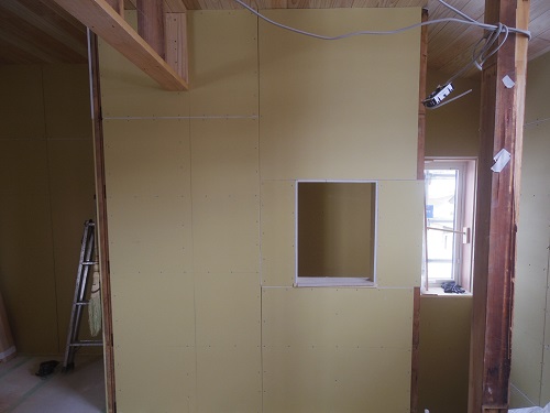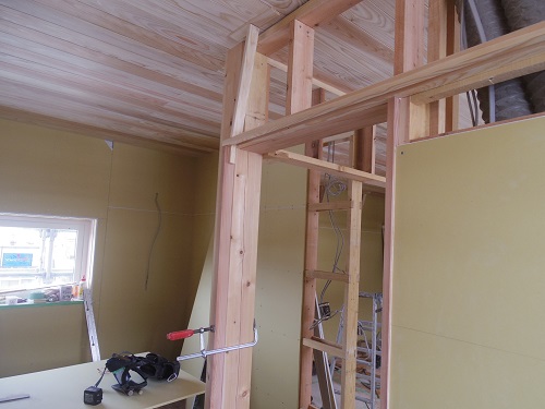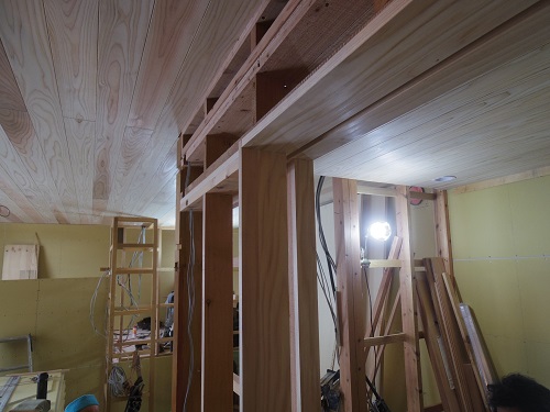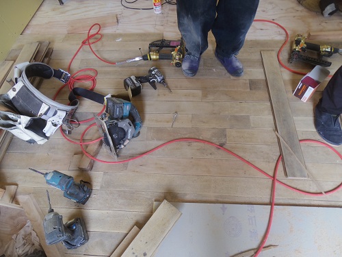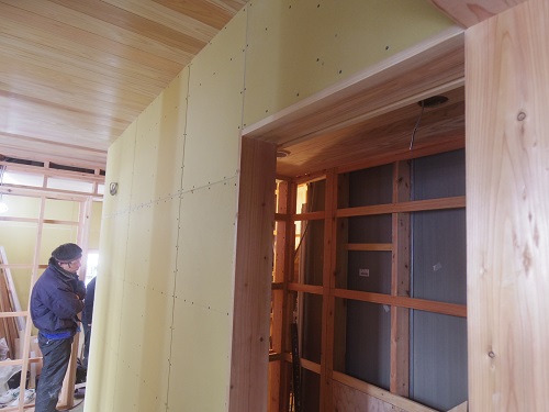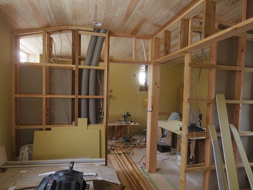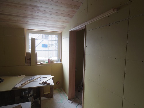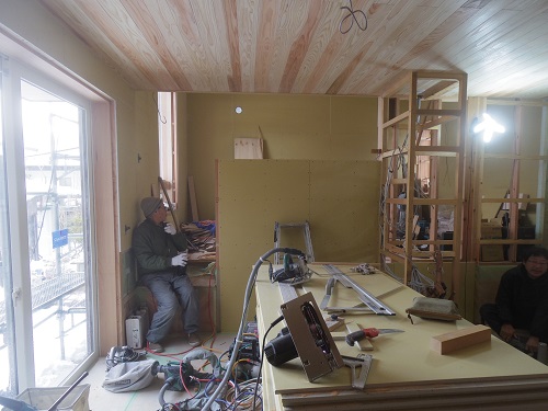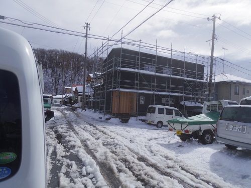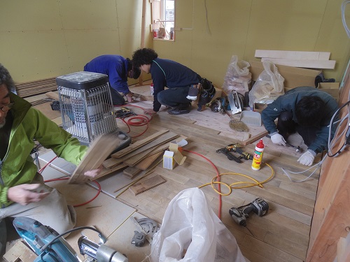 雪が降った後の昨日の午後の進捗です。目標の床は張り終えました。引き続き間仕切り壁と造作工事が進みます。