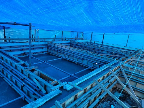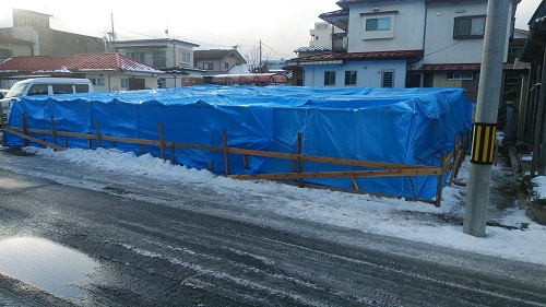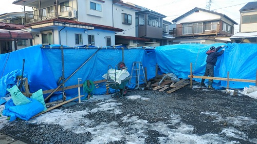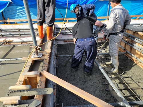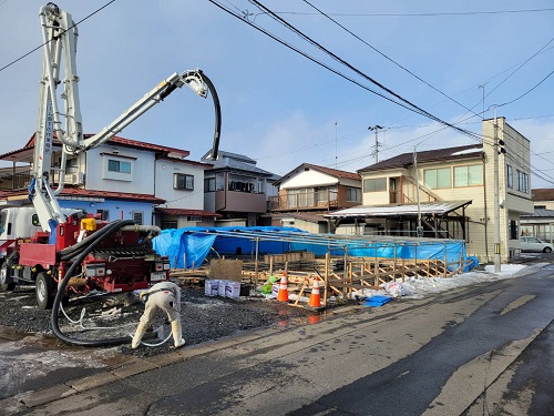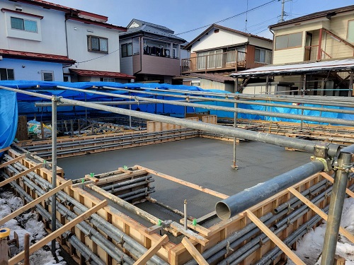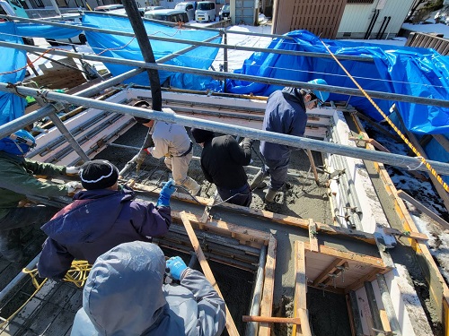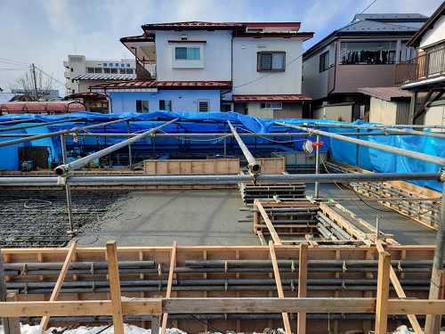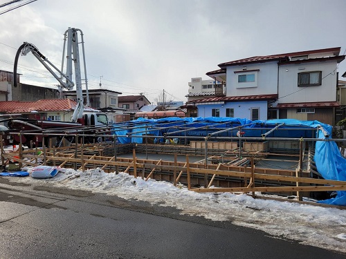 基礎コンクリート無事打設しました。冬場なので、雪囲いの屋根を掛け込んで暖房を焚いて養生しました。