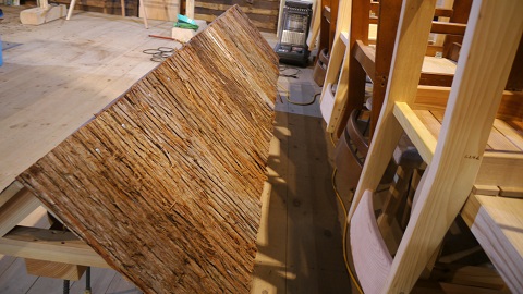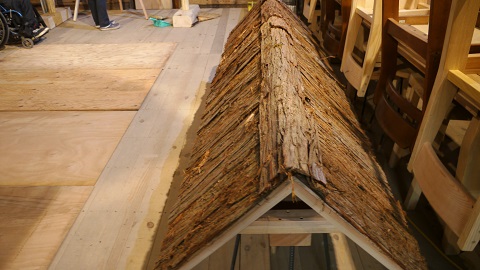 看板の杉皮の屋根が完成です。