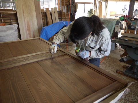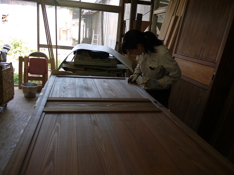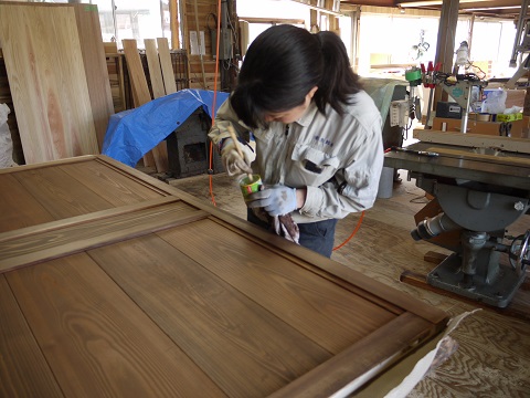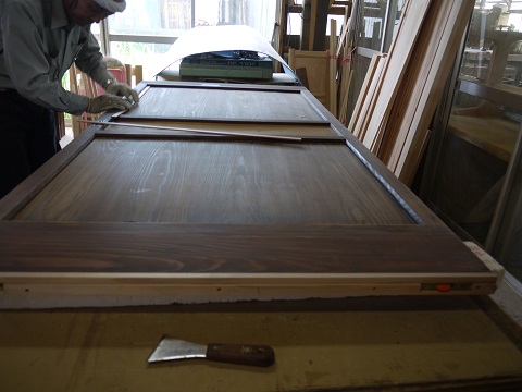修繕建具に柿渋を学びながら塗って補修している相川です。