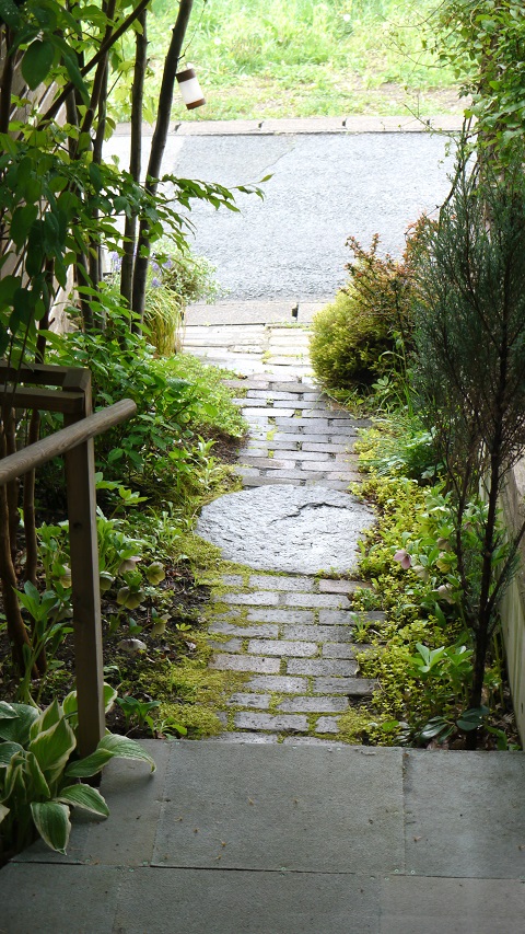 自宅の玄関へのアプローチです。小雨が降るとこの様なふんいきになります。そろそろ一雨欲しいですね。・・・道路に向かい玄関があるお家がおおくなりましたが、こうしたアプローチを設けるのもいいもんですよ。