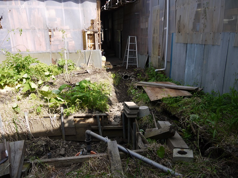 作業場の中庭は、雨が沢山集まるので、排水路の整備は欠かせません。何とも貧乏じみた廃屋のような風景ですが、シドケやウドにフキが採れる豊かなところなのです。