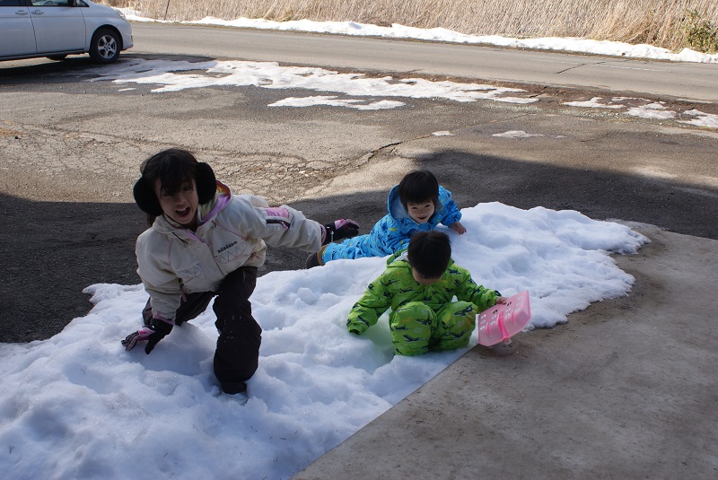 雪で楽しそうに遊ぶ孫たちです。