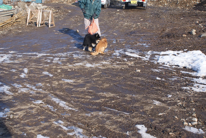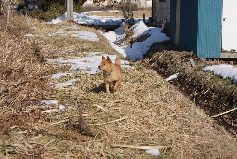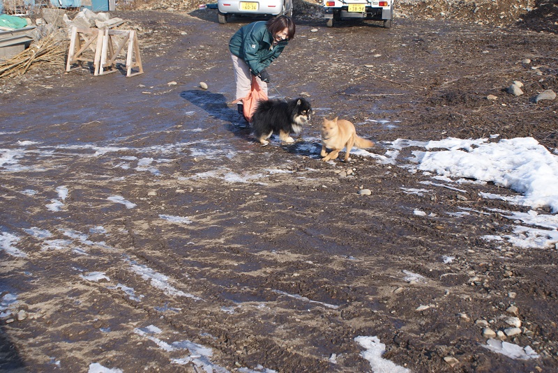 茅狩の応援にきているハナと人に懐かない当家のクマが仲良くしていました。