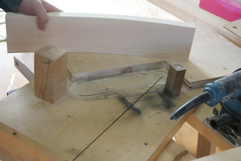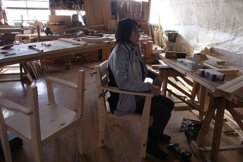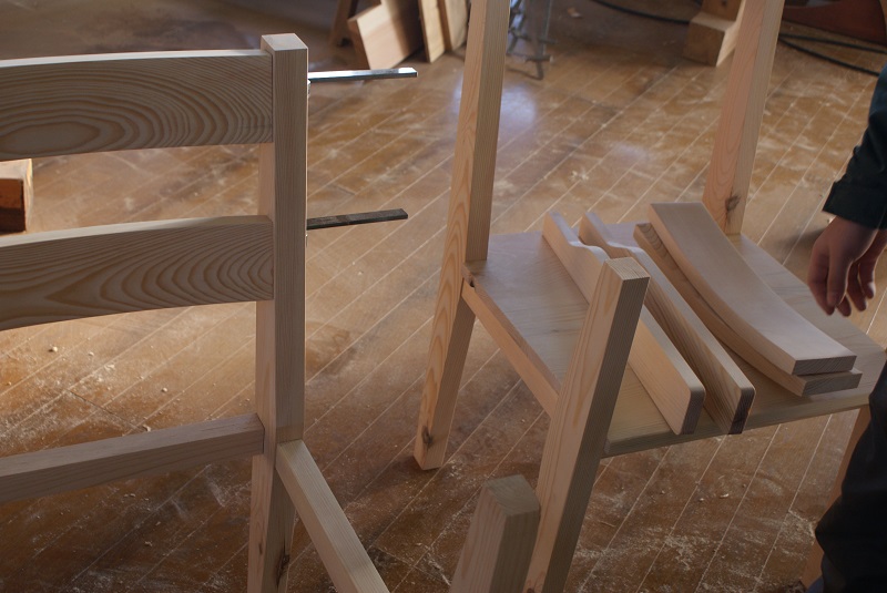 南部赤松の椅子造りが進んでいます。写真は背凭れの曲がり板をどうやって作ったかの説明を受けた時のものです。いい感じのカーブが背中に優しいと思います。完成が楽しみです。