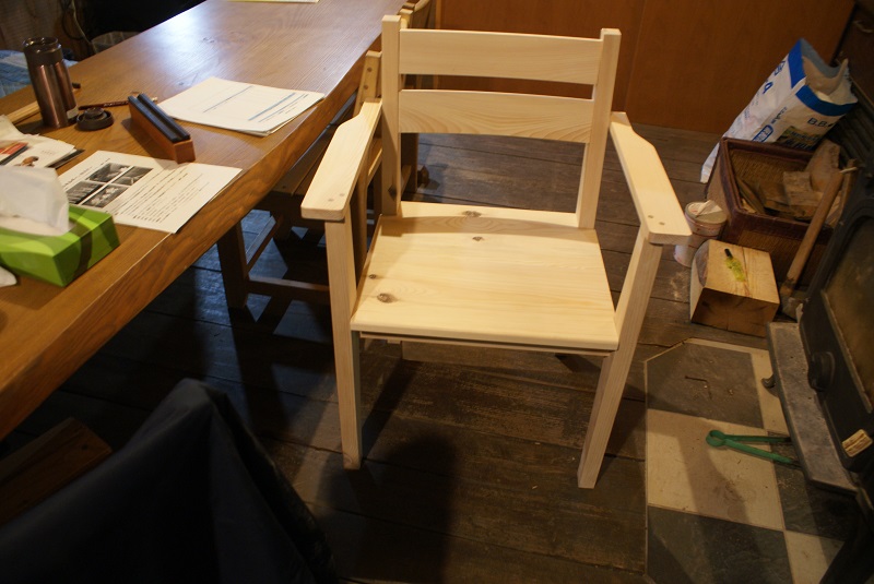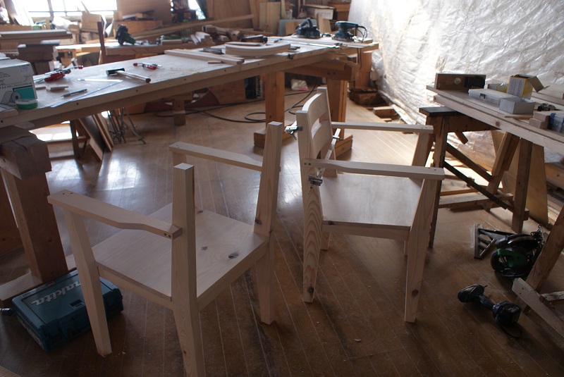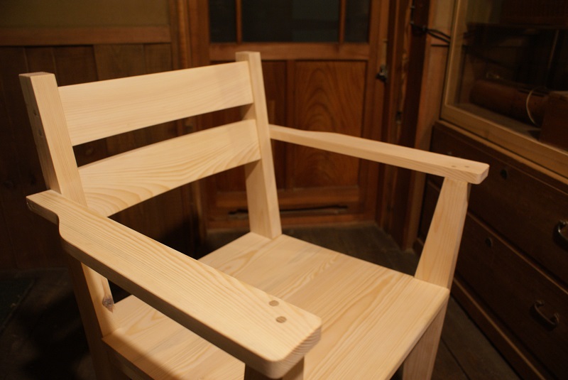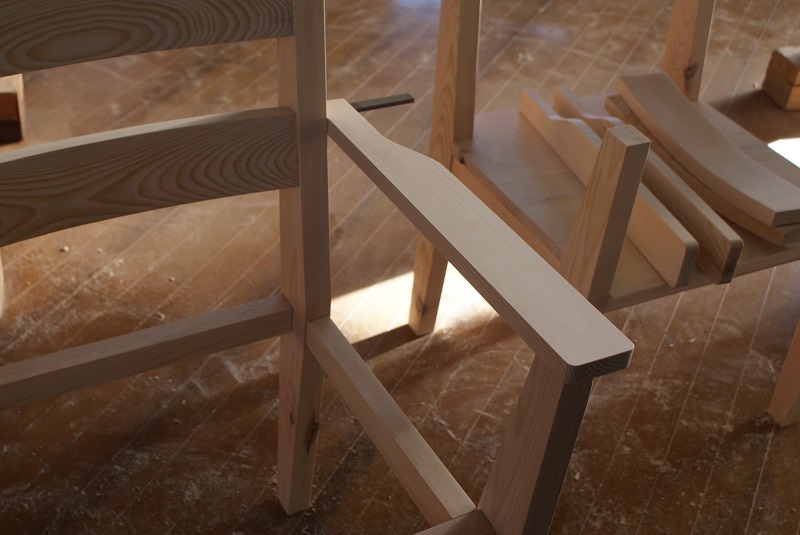 大方完成で、今日の夕方には組み上がる予定です。南部赤松の肘掛け付きの椅子!杢創舎オリジナル商品となります。