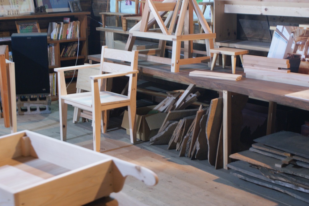 木のお店に、南部赤松で創作した椅子と手持ち箱を展示販売しています。