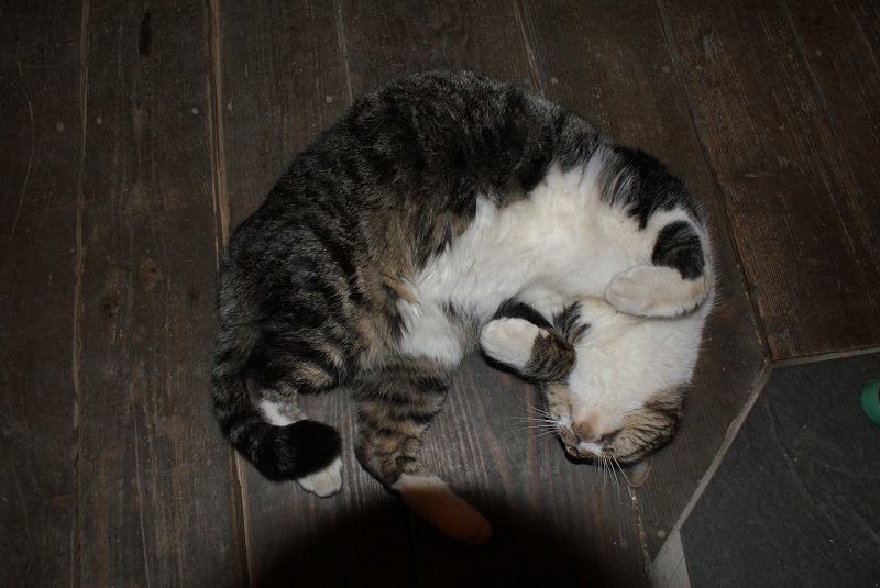 好摩の私の仕事机の窓からの景色です。この雪煙がこの後太陽光でキラキラと光り輝くのが幻想的です。その机の横で猫がこの姿です。・・・笑