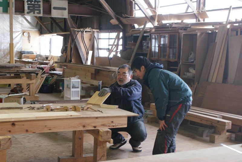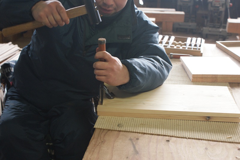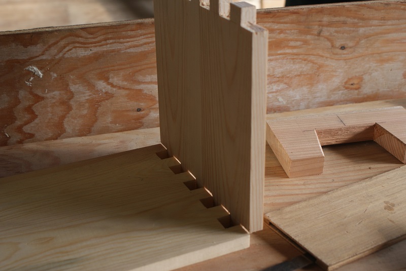 木工の箱角の継ぎ組の中でも有名なのがアラレ組み継ぎですが、現代では専用のジグと機械を使用すれば案外簡単に出来る様になりました。でも、やはり最初は手で造る事を覚えさせようと先輩たちが付きっきりで指導していました。これが出来る様になると一端ですね。