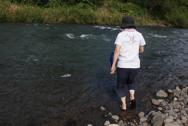 川遊びでサンダル流されたのを、虫取り網ですくい取った所です。