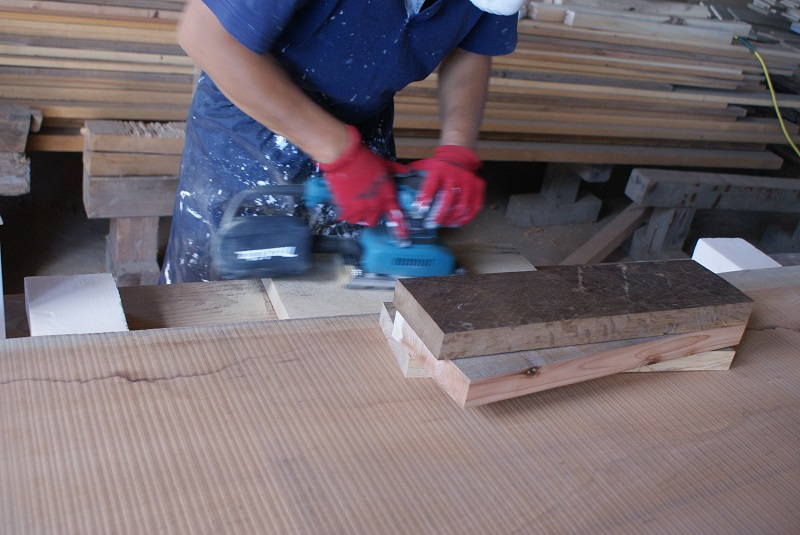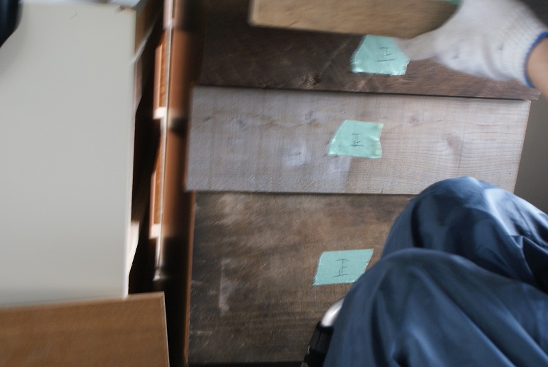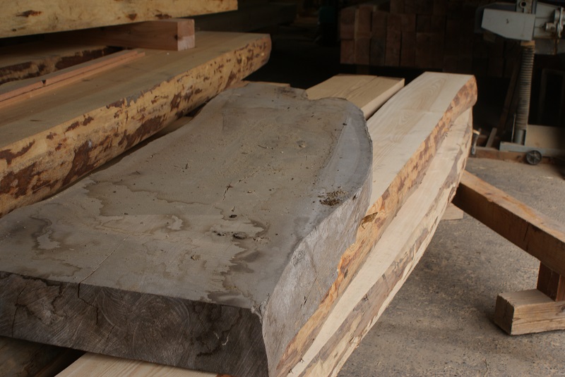 玄関框に使用する予定の大きな一枚板が出番待ちで準備されています。とにかく当社場内には、こんなのが大量に積み置かれているのです。