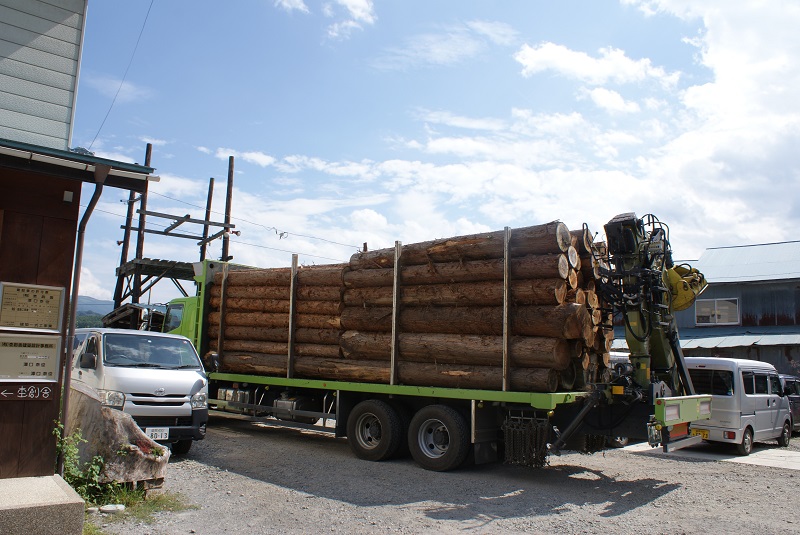 昨日、杉丸太が運び込まれました。凄い迫力です。