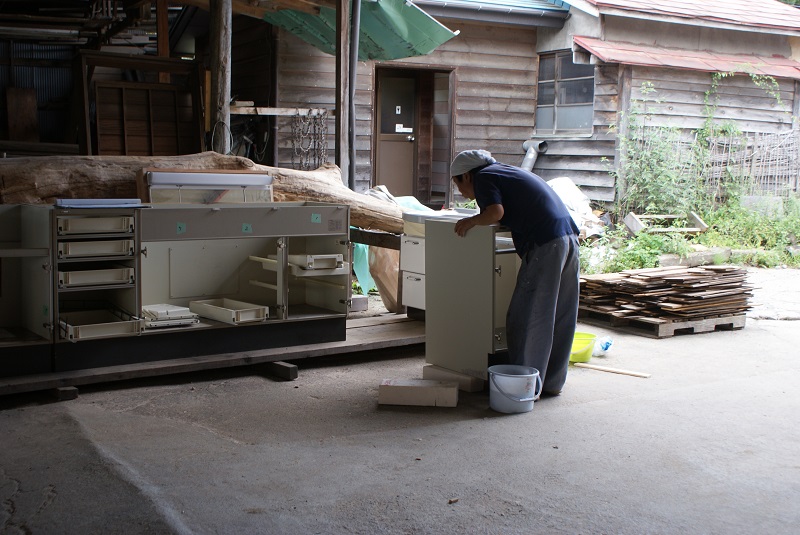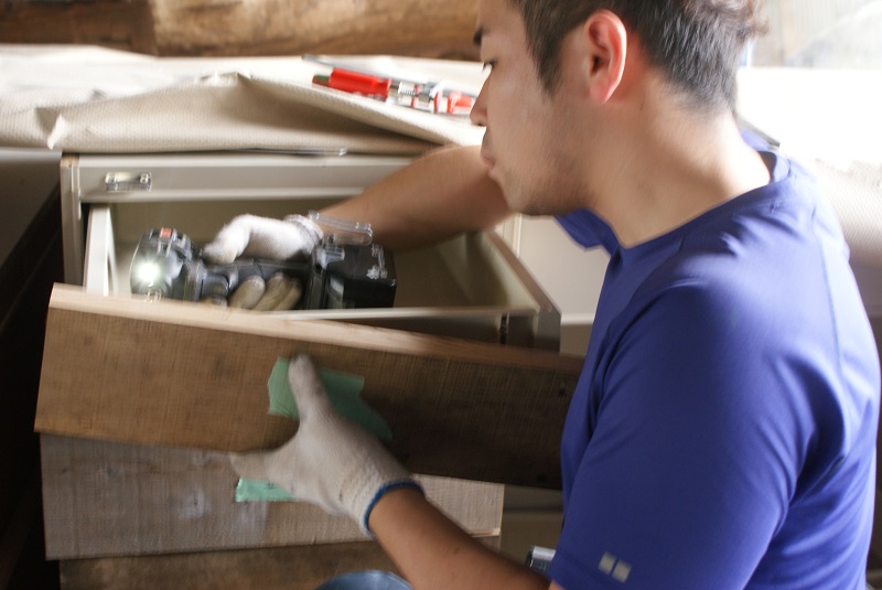 流し台の掃除や板の磨き込みは塗装職の瀬川が手伝っています。
