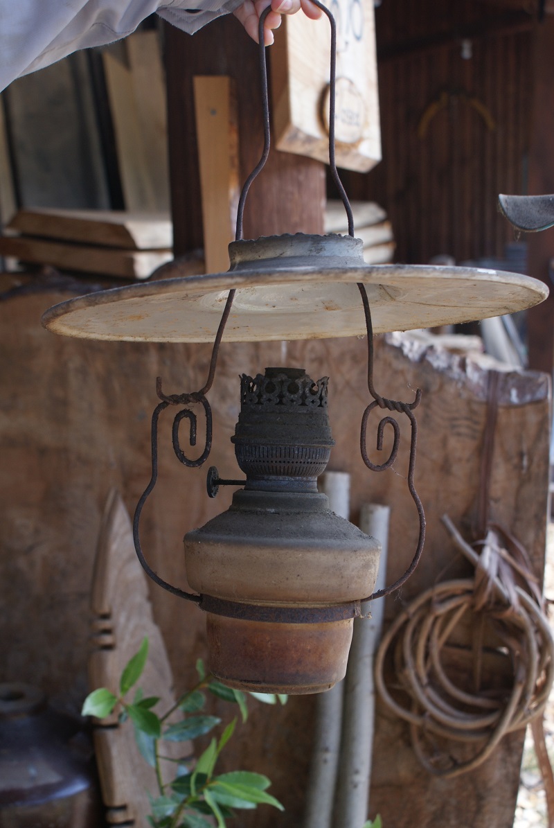 腰駕籠やランプを洗って、干している、骨董品市場のような木のお店の入り口です。
