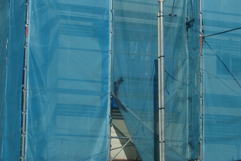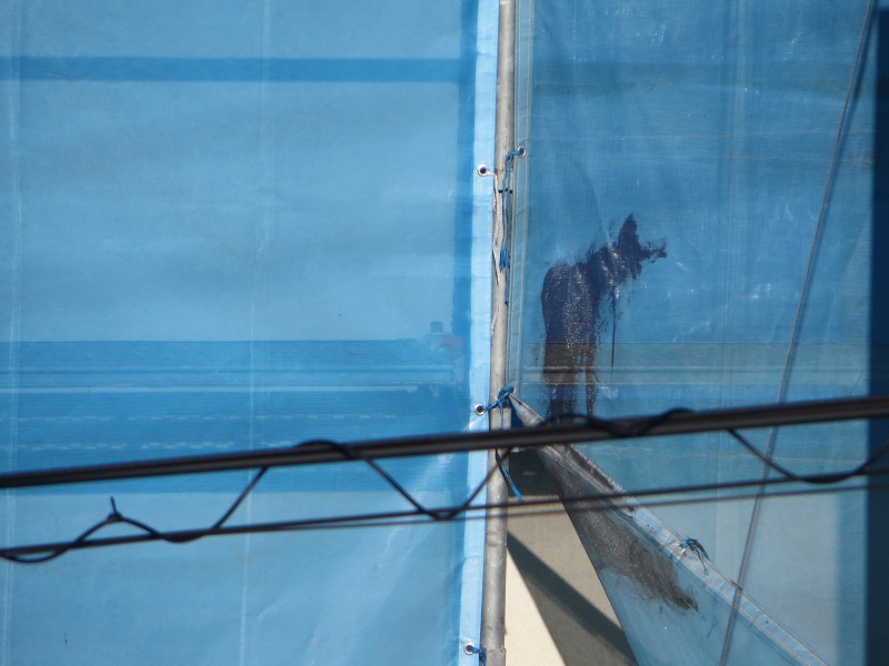 自宅向かいの工事現場の足場ネットに猫の居るような染みがついてました。