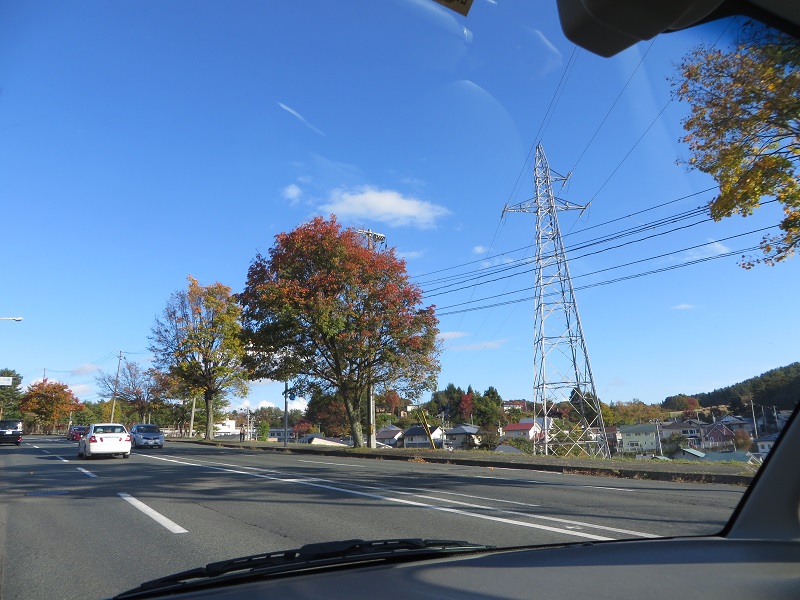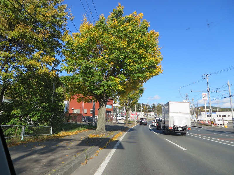 通勤路で見る高松公園からの岩手山方面と街路樹の紅葉です。