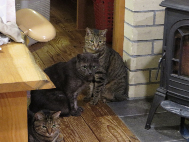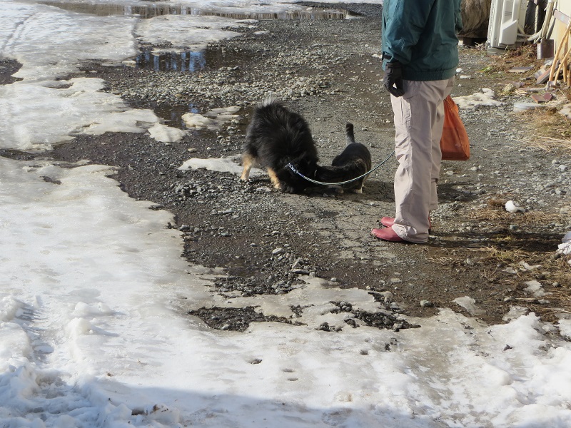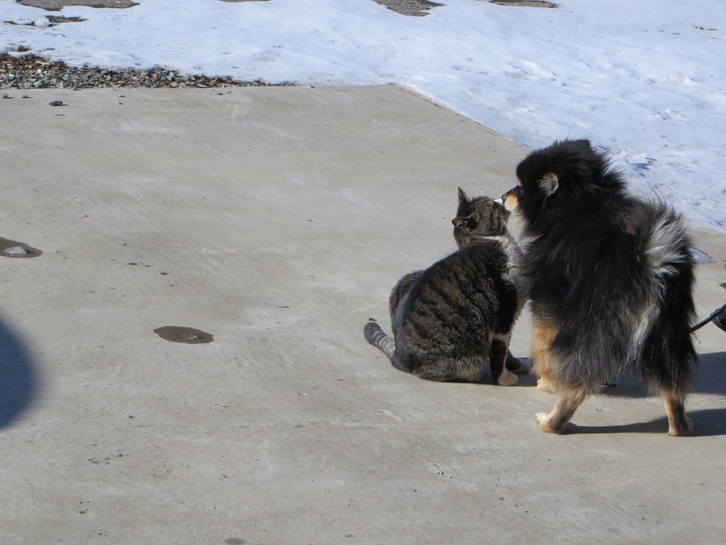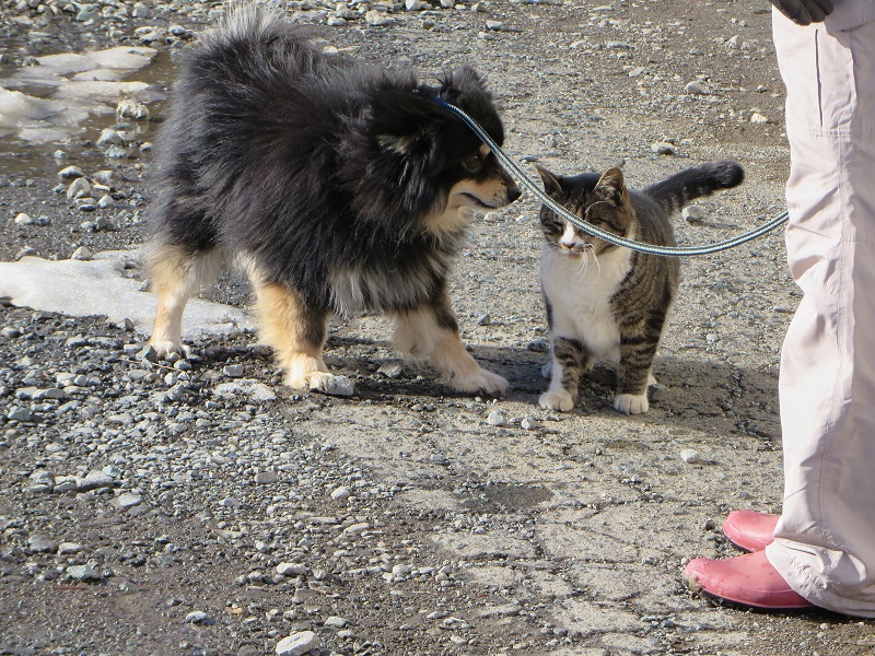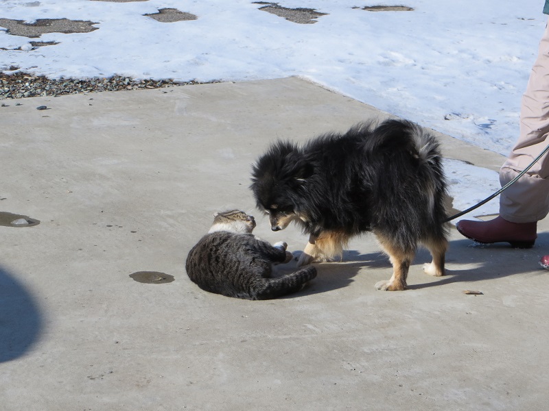 正月休みでも、犬の世話をしていると、猫がやってきます。久し振りの御対面で嬉しそうなのは犬ばかりで、猫の方は迷惑そうな雰囲気でした。