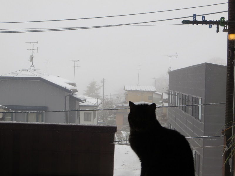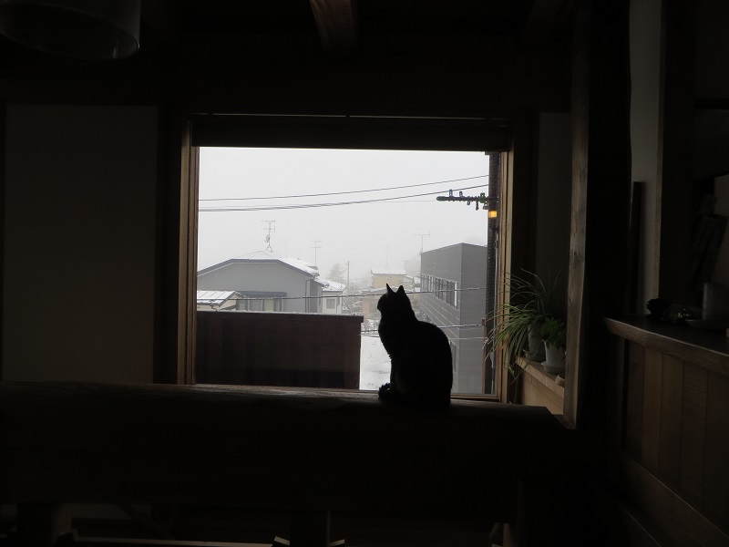 外は雪、猫のシルエット。