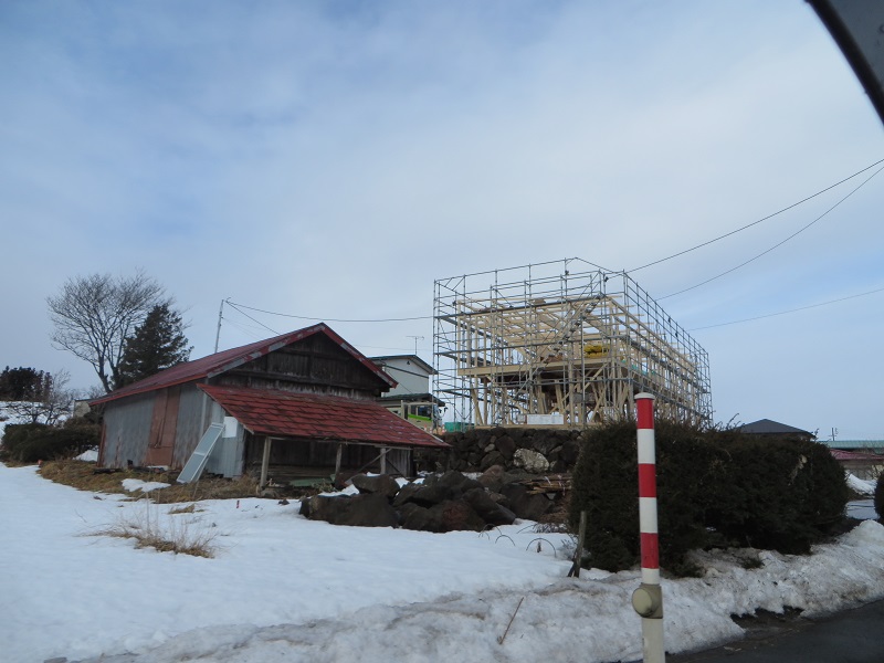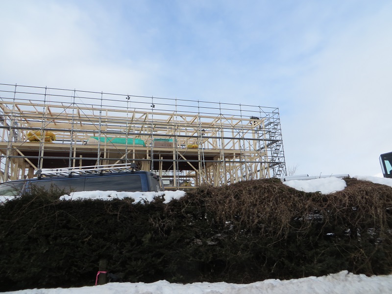 例の石積みの上に建て方が進んでいます。大きくて豪華そうですが、普段見ている構造材と見比べると、とても細く小振りに見えるのが職業病で残念と感じてしまいます。