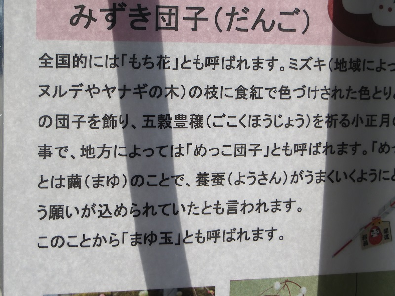 一応の説明はみずき団子になっていますが、飾ってあるものが違います。でも季節の風物詩にはなりますね。