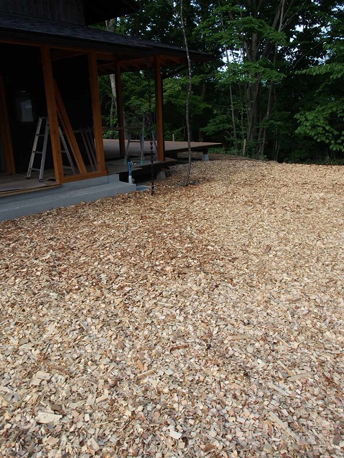 今月完成して、月末~完成見学会の予定の滝沢の新築工事現場にウッドチップが敷き込まれました。