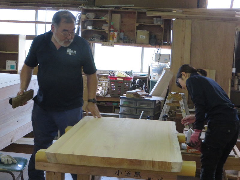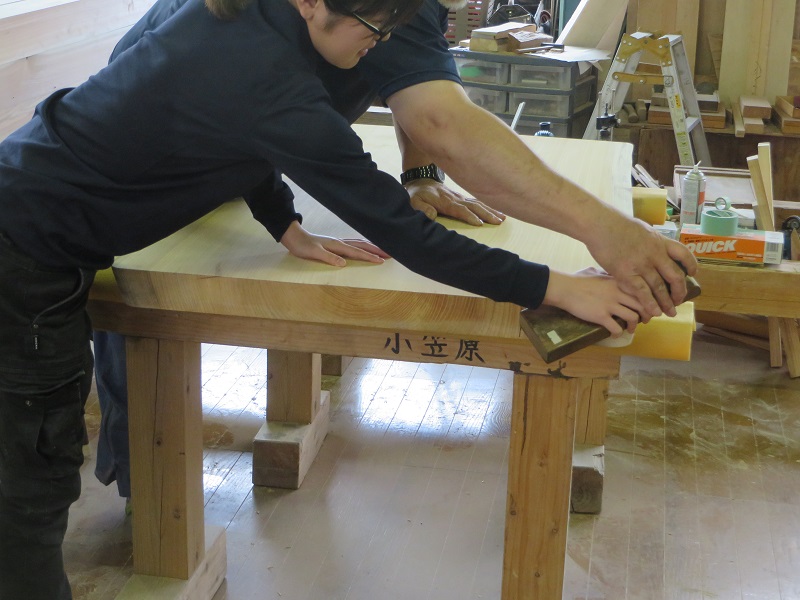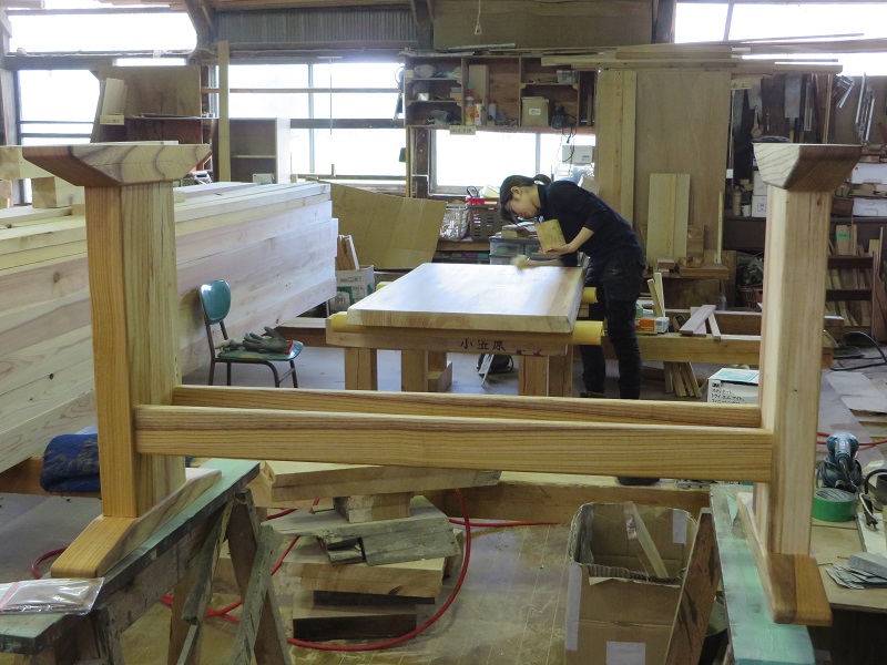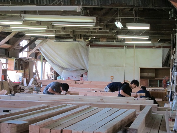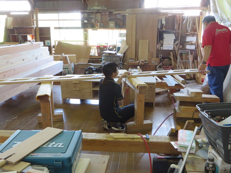 作業場では、若手大工の鑿で削り出す音が響きわたります。(栗城)