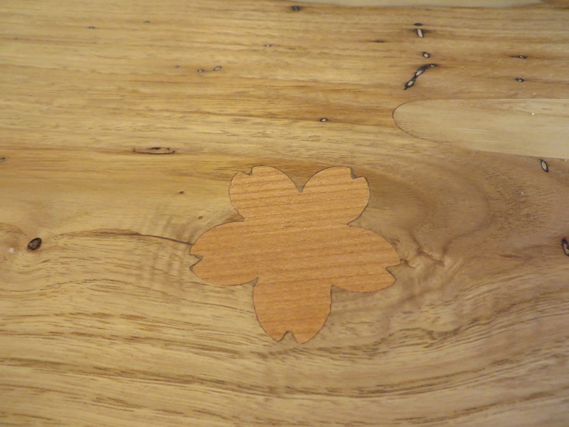 先日の完成見学会会場の流し前カウンターに埋め込まれた桜とモミジの木の象嵌です。
