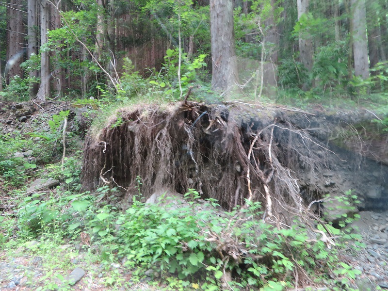 岩泉町の新築現場に行くと近場の杉の木の根元が大雨で削り取られて枯れていました。