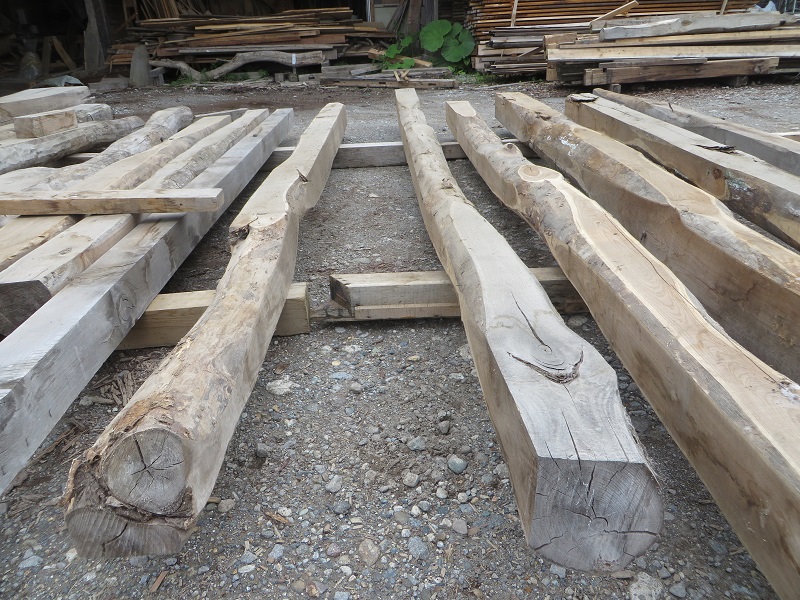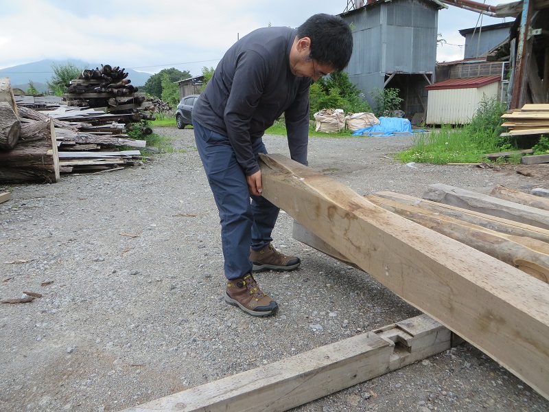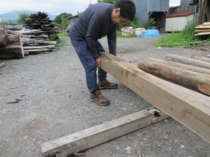 槐の柱の選別をしているところです。麻痺で動かない左手に持たせてみたらで持ち上げる事が出来ました。普通に持っても重いのですが、何とかここまで出来る様になりましたね。