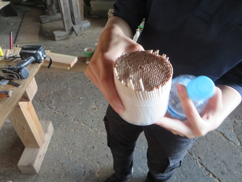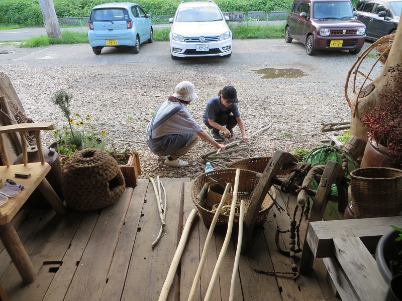 道路端の胡桃の木を伐採している方から、処分前の枝を貰ってきて、樹皮剥ぎをしていました。専務のお手伝いをしているのは入社2年目の鈴木です。