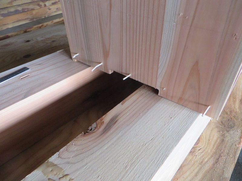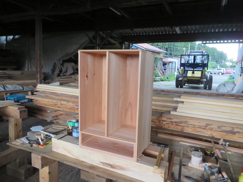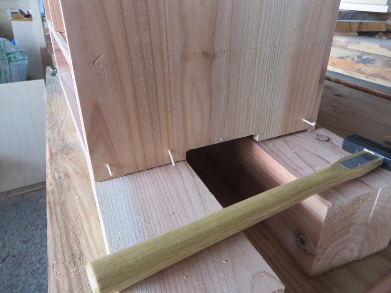 先日修復した古民具の棚を真似て、新たに造っています。木の釘もそのままに真似てみました。