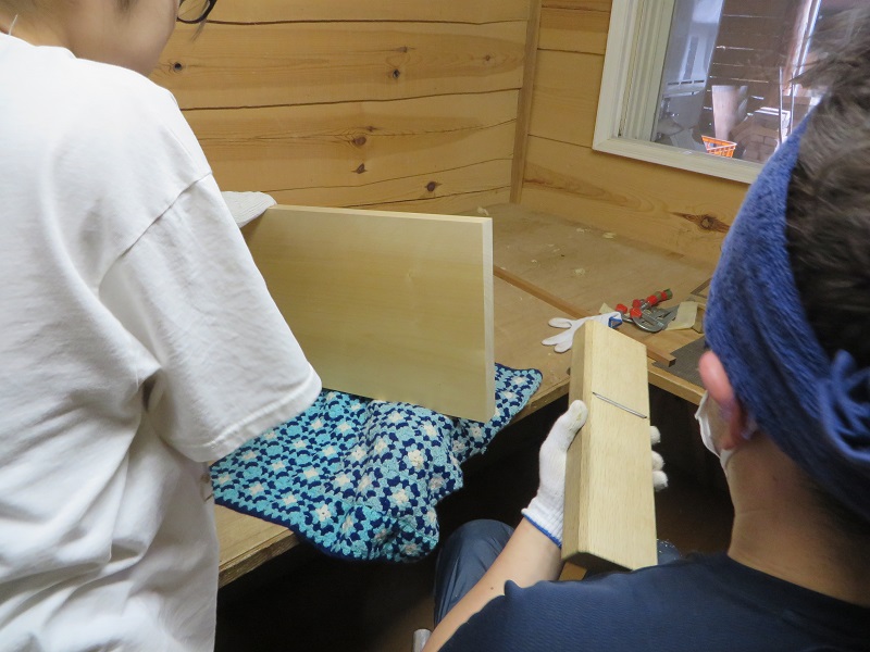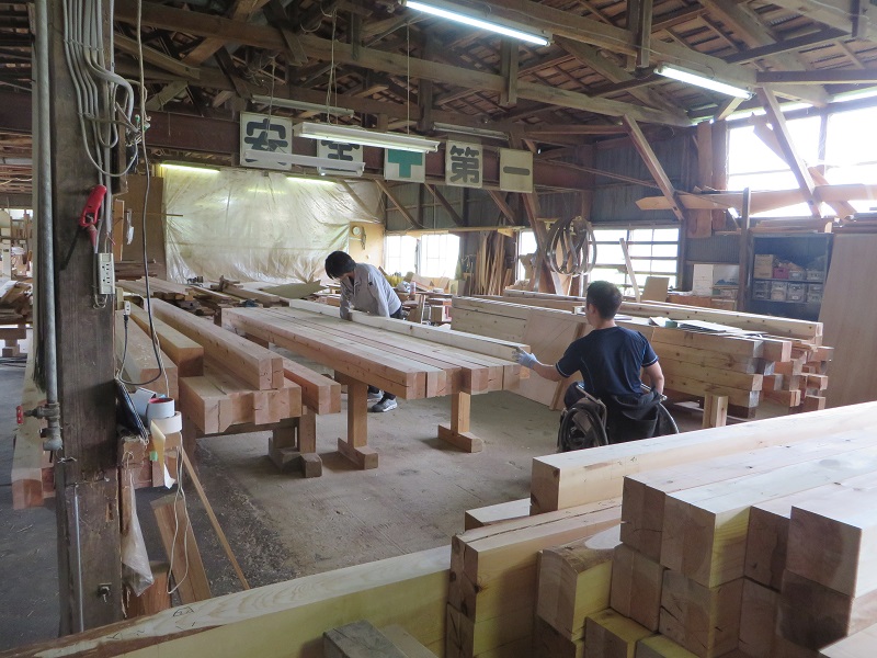 岩泉の新築工事の墨付けをしている車椅子大工の手伝いをしている風景ですが、これを車椅子大工は時折一人でしている姿もあります。