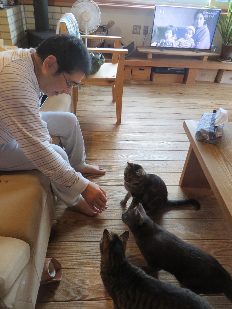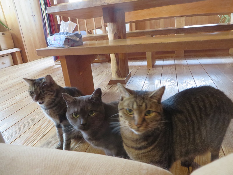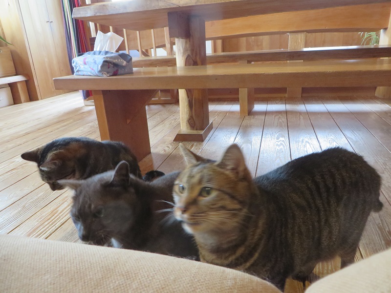 またしても家猫ですが、おやつの順番待ちしている猫三匹です。