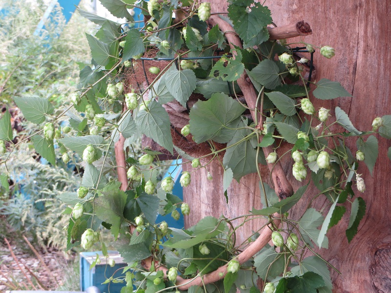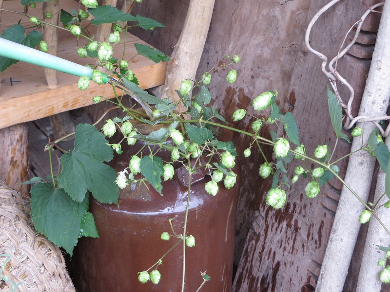 好摩場内で採れたホップを木のお店の入り口に飾りました。